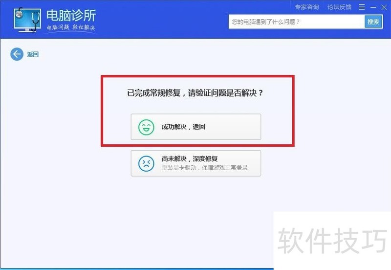 8、 在电脑诊所界面中出现“已完成常规修复”字样说明已完成了。