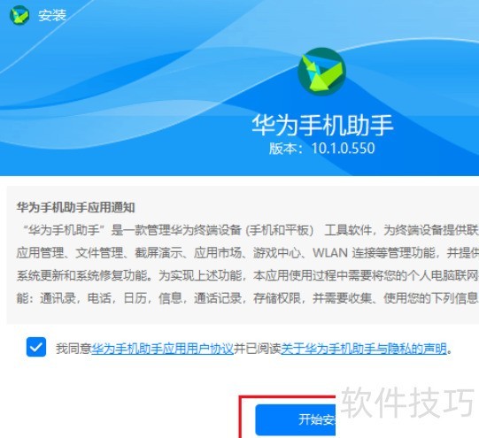 7、 点击勾选【华为手机助手应用用户协议】,点击【开始安装】