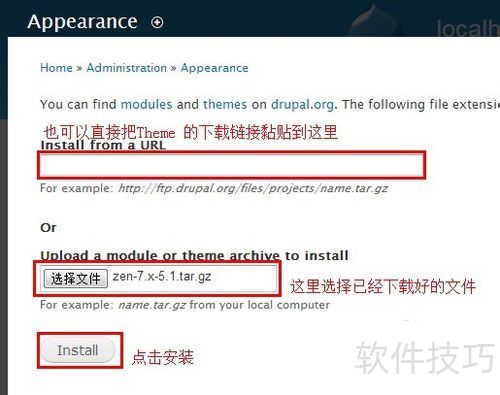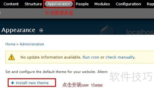 1、 首先打开drupal网站,来到“霸冲Appearance”管理界面下,点击“Install new theme”按钮。