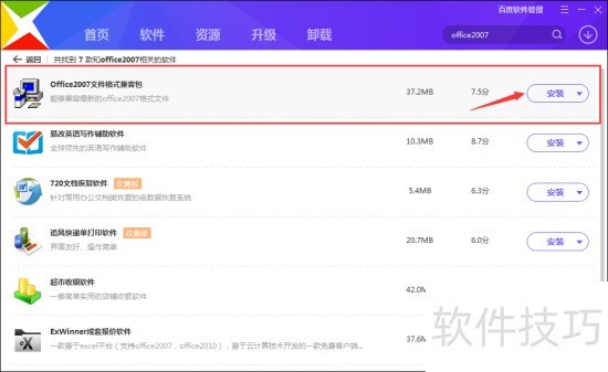 3、 三、在搜索出来的结果中,选择“office2007文件格式兼容包”选项,点击后面的“安装”按钮。如图所示;