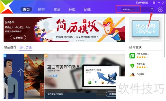 2、 二、在网络软件管理窗口界面的搜索栏中输入“office2007”再点击搜索按钮。如图所示;