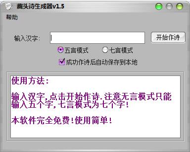 官方软件分类:大小:2.49 MB时间:2026-04-23软件介绍: 立即下载7.5字7字藏头诗生成器