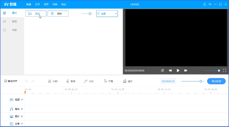 1、打开ev剪辑软件,点击“添加”按钮导入需要修改的视频。