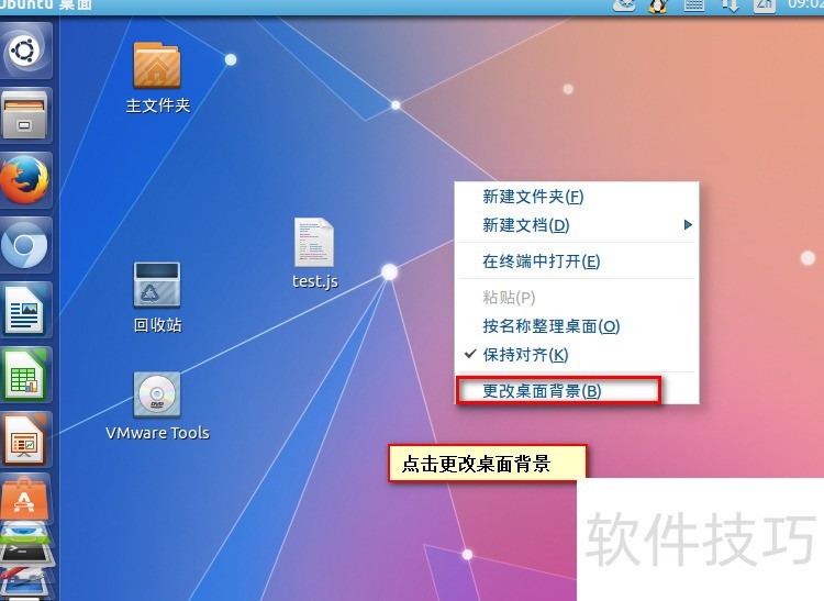 1、 首先我们打开ubuntu系统主机,并使用root账号登录。然后在桌面右击,在弹出窗口内,点击更改桌面背景。