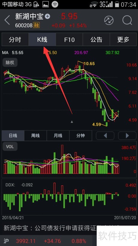 4、 再点击K线。就进入到这个股票最近一段时间的涨跌K线,