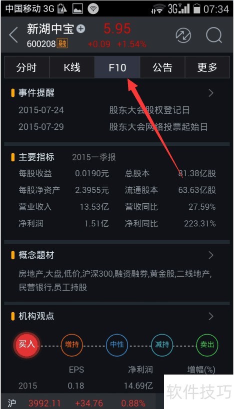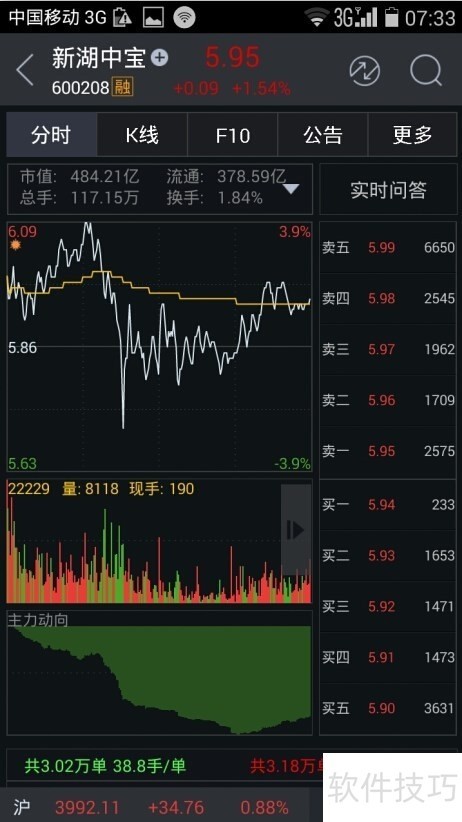 3、 然后你就进入到这个股票的信息页面。首先是它的实时的指数线,可以了解这只股票今天的涨跌情况
