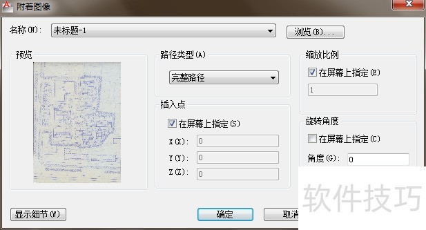 5、 选择好打开文件后点击【打开】选项,弹出附着图像窗口,该窗口主要目的可以指定插入的及旋转角度,如下图所示。
