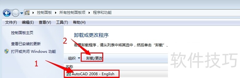 3、 在“名称”下面找到AutoCAD,并点击,然后在点上面的“卸载/更改”