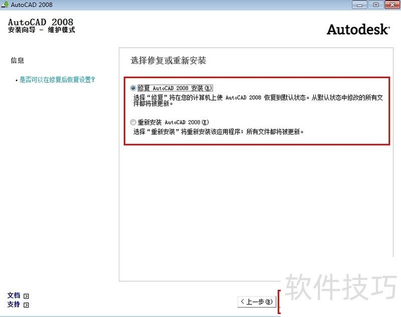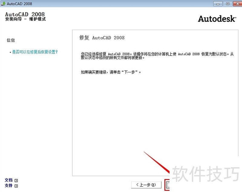 6、 “修复AutoCAD 2008”,点击“下一步”