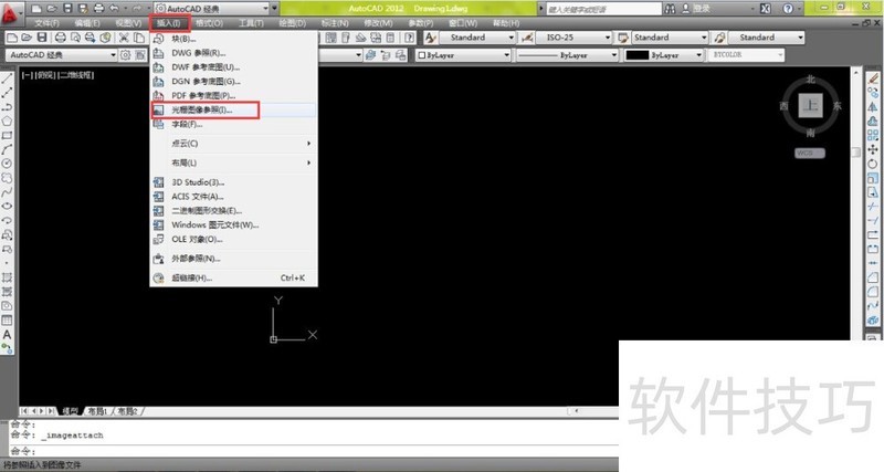 2、 点击上方菜单栏里的【插入】选项,弹出下拉菜单,在下拉菜单里找到【光栅图像参照】选项,如下图所示。
