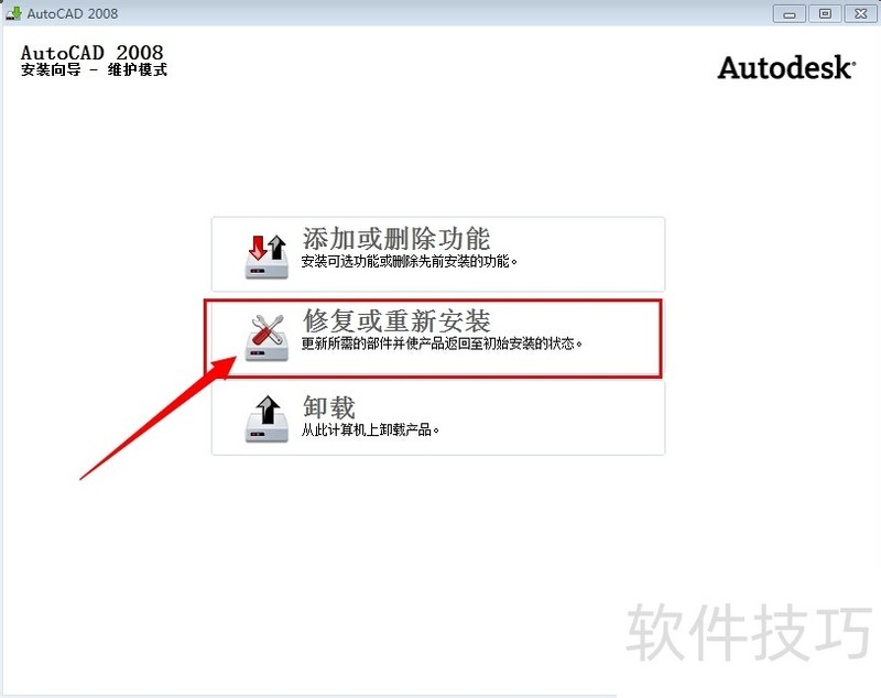 5、 之后在出来的“AutoCAD 2008安装向导 - 维护模式”下选择“修复AutoCAD 2008安装(R)”,点击“下一步”(选择重新安装也行)