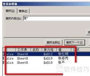 5、 那么,查找对话框下部分即显示出符合要求的单元格地址。所有“张”姓的人名就查找出来了。