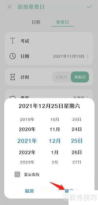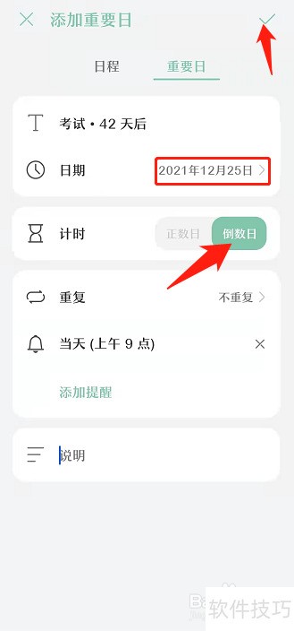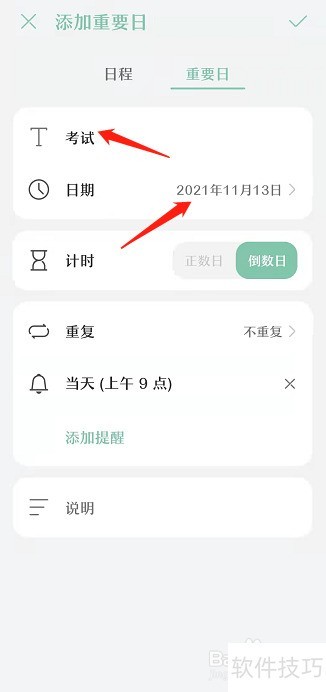 2、 在新增日程页面点击重要,然后输入倒计时日程的名称为考试,并点击日期设置。