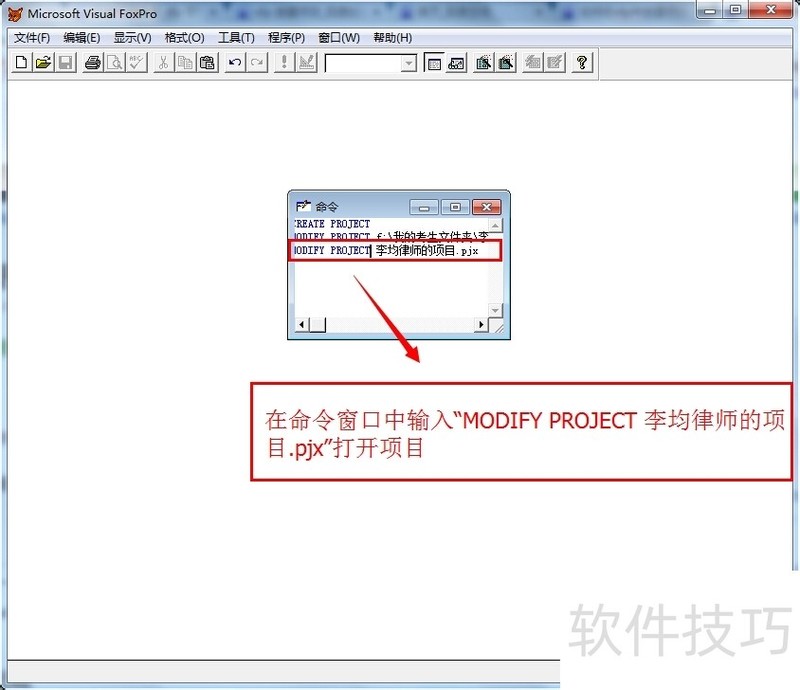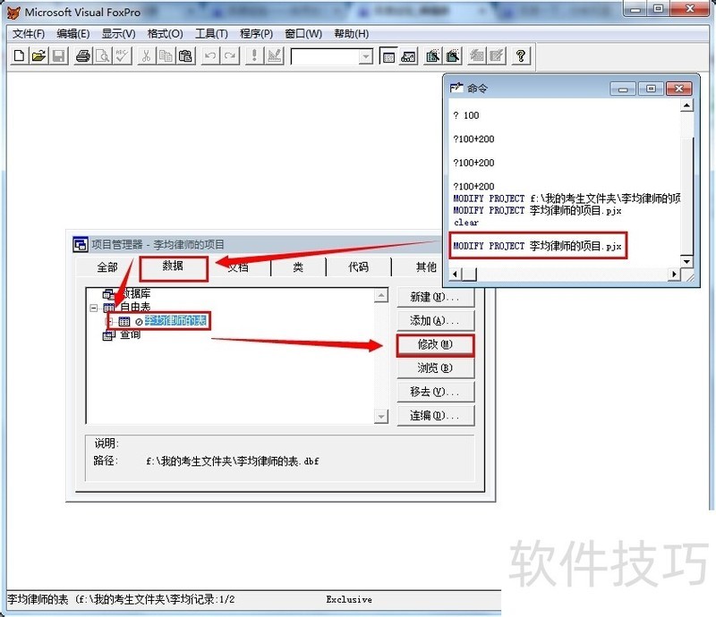 2、 使用命令“MODIFY PROJECT 李均律师的项目.pjx”打开项目【李均律师的项目】