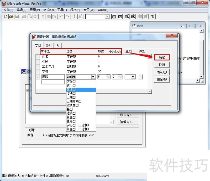 3、 在修改界面做如下操作:(1)依次修改【字段】、【字段类型】、【宽度】等;(2)单击【确定】按钮保存修改;