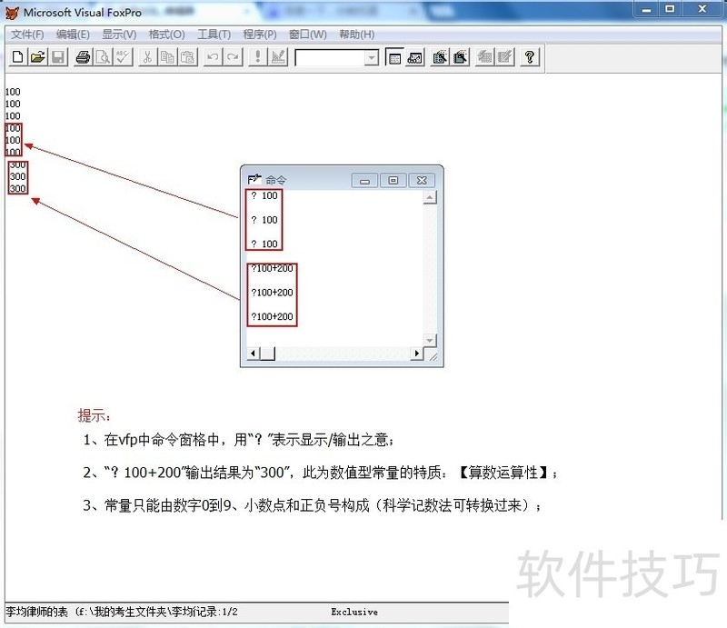 2、 在软件界面依次操作,显示数值型常量:(1)在命令窗口输入“? 100”→→显示输出【100】;(2)在命令窗口输入“? 100+200”→→显示输出【300】