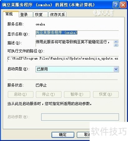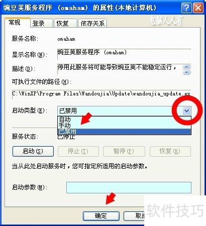 4、 同样,也对另一个豌豆荚服务程序 (omaham)已禁止(如果已启用点击停止)确定。