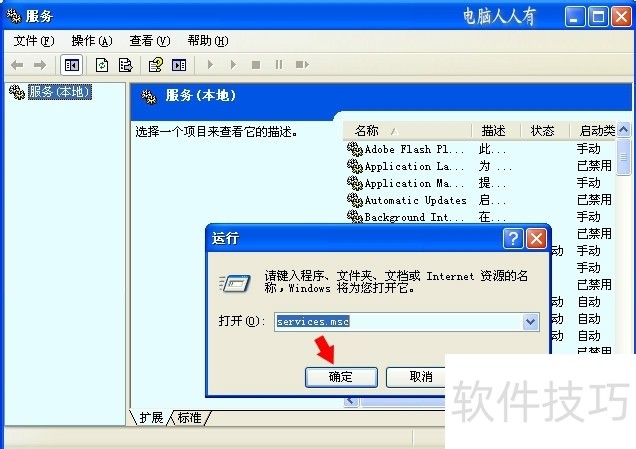 1、 开始→运行→输入:services.msc 点击确定(或按回车键)打开服务。