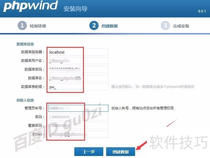 5、 在环境检测通过后,需要输入 数据库信息 和创始人信息 来创建数据