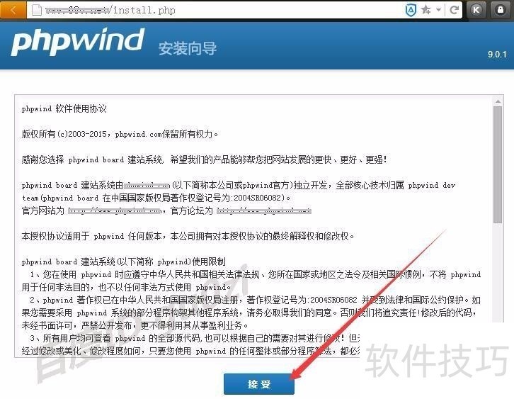 4、 打开浏览器,输入你的域名/install.php,默认情况下如果没有安装过的话会自动弹出协议,这里点击 接受