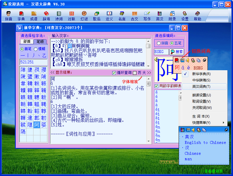 汉语大辞典是一款收录了大量汉语词汇和成语的工具软件。它提供了丰富的数据内容,包括成语50999条、汉字20973个、词语384913条等。用户可以通过该软件快速查找所需词汇,并了解其含义和用法。此外,汉语大辞典还支持鼠标取字、屏幕取词中英翻译等功能,方便用户进行多语言交流。同时,该软件还提供了智能升级和兼容性修复功能,确保用户始终使用最新版本并解决兼容性问题。总体而言,汉语大辞典是一款功能强大且易于使用的工具软件,适合各类用户群体。