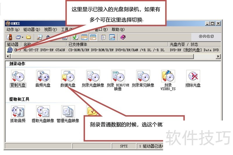 1、 如下图:运行软件后,如果有多个光盘刻录机可以选择,可以切换先选择您要刻录光盘的方式,这里使用 "数据光盘" 为例