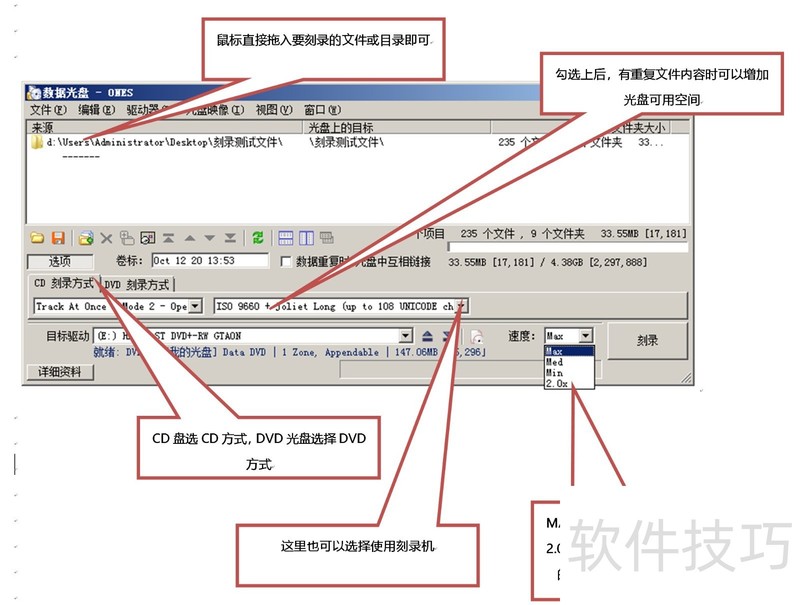 2、 如下图:设置好刻录爷墨参数和需要刻录的文件及目录内容注意歌槐裹看图片上的注解重要事项再磨叽一遍,刻录光盘类型请一定选择正确刻录速度选择很重要。如果资料重要,尽量选低些的速度,刻录兼容性好,不爱废盘。