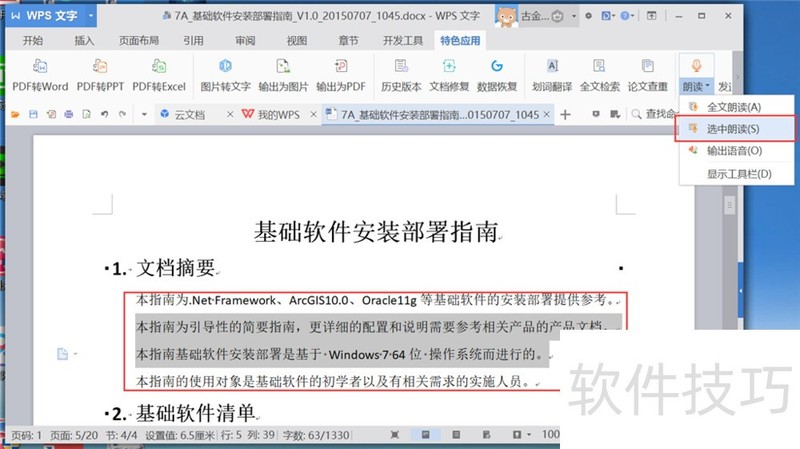 5、 选择WPS文字文档中的部分文字,点击WPS文字菜单栏“特色应用”选项卡下的“朗读”—“选中朗读”按钮,可以朗读选中的文字。