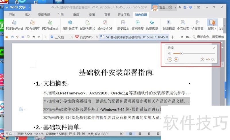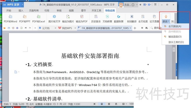 4、 点击WPS文字菜单栏“特色应用”选项卡下的“朗读”—“全文朗读”按钮,可以朗读全文。
