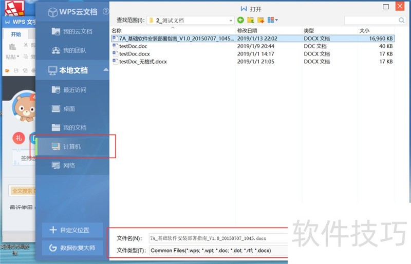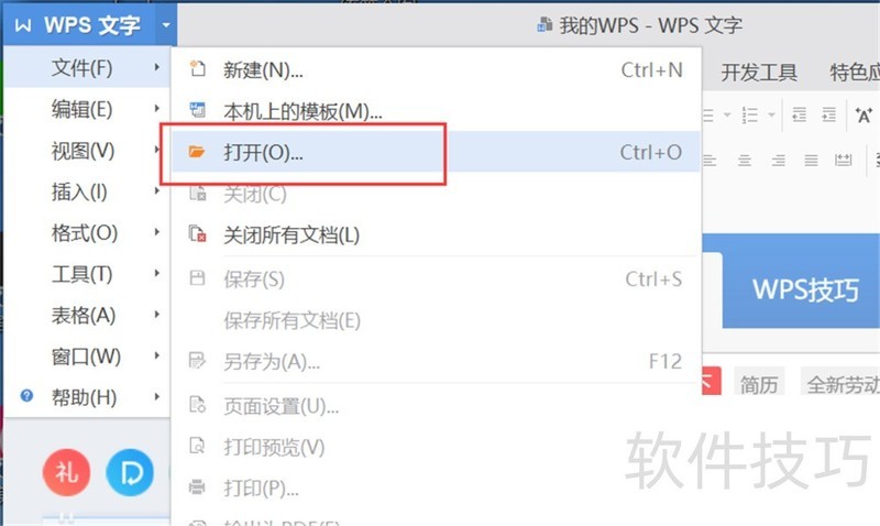 2、 点击WPS文字菜单栏的“文件”—“打开”,打开文件浏览对话框。