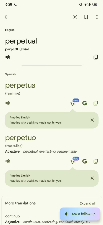目前,“练习”功能仅支持英语和西班牙语之间的互译。用户可以在英语和西班牙语之间启用“练习”功能,进行语言学习。