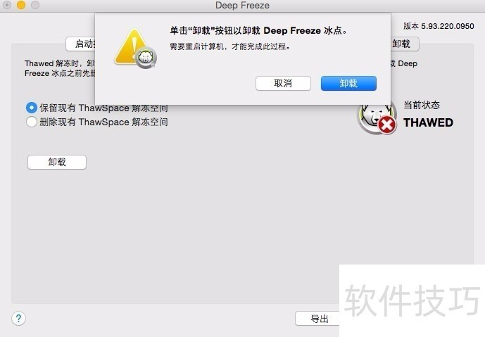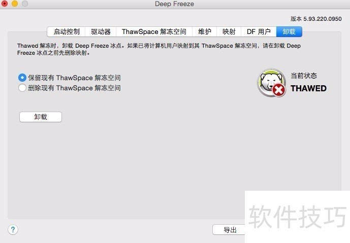2、 在操作界面上,点击标题栏中的“卸载”,卸载冰点软件需要在Thawed解冻的时候进行的,可以在界面下方看到当前软件的状态中打了一个叉叉表示是解冻状态,可以选择保留或是删除以后的ThawSpace解冻空间,完成后点击“卸载”