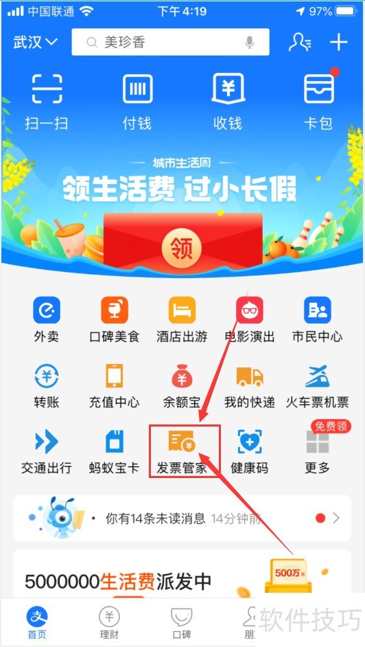 1、 登录支付宝App,点击【首页】上的【发票管家】。如下图: