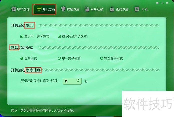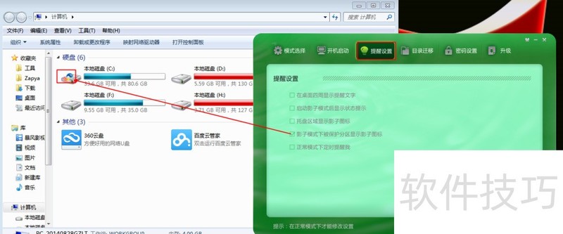 3、 提醒设置:可以设置进入后在什么地方提醒,避免保存数据时忘记了在影子系统下操作。
