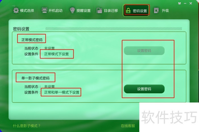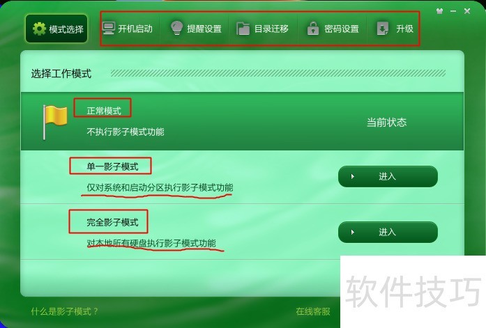 1、 模式选择:正常模式、单一模式、完全模式。三种模式保护范围不同,正常是不保护,单一是保护系统盘,完全是保护全部分区。
