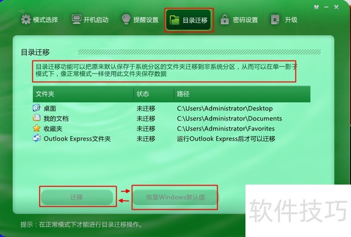 4、 目录迁移:迁移目录后单一模式下可以保存一些基本信息等。