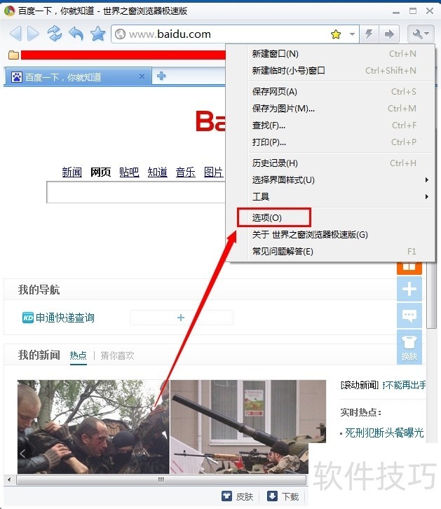 3、 然后点击“选项” 进入世界之窗浏览器的安全设置 ? 如图