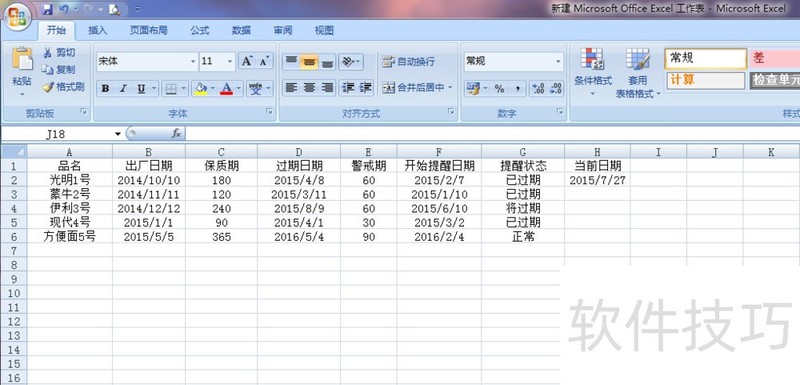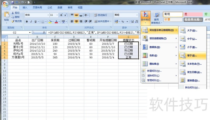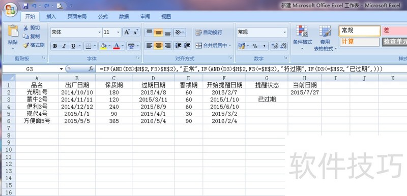 1、 输入数据,明确逻辑关系2在关键的地方输入关键的参数,=IF(AND(D3>$H$2,F3>$H$2),"正常",IF(AND(D3>$H$2,F3<=$H$2),"将过期",IF(D3<=$H$2,"已过期",)))