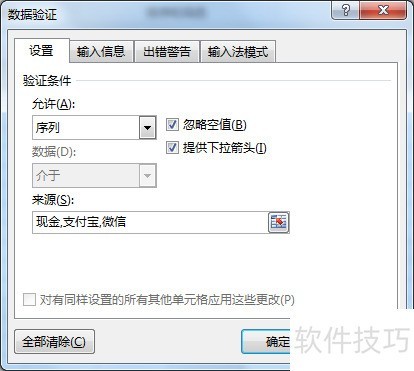 3、 打开“数据验证”界面,在“设置”中的“允许”栏中选择“序列”,在来源中输入你要的内容,如现金,支付宝,,点击确定切记:在半角模式下输入逗号。
