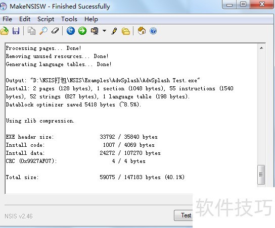 4、 打开MakeNSISW,即脚本编译器,载入脚本,可生成打包程序,Output显示生成安装包的目录
