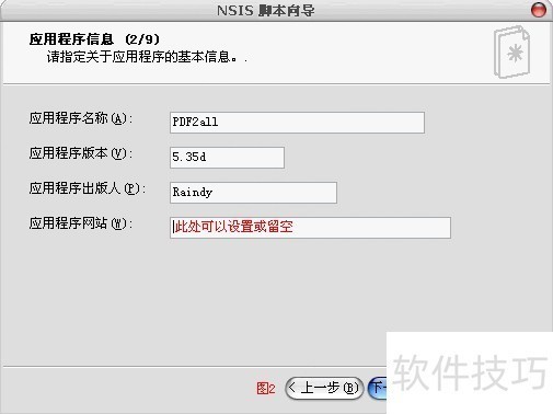 2、 设置应用程序信息,如软件名称、版本、出版人等,如图2。当然最一个网站可以留空,如果设置了,则安装包会生成一个对应网址的“Internet 快捷方式”。