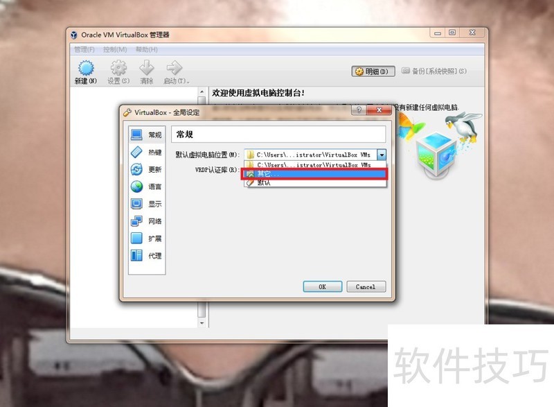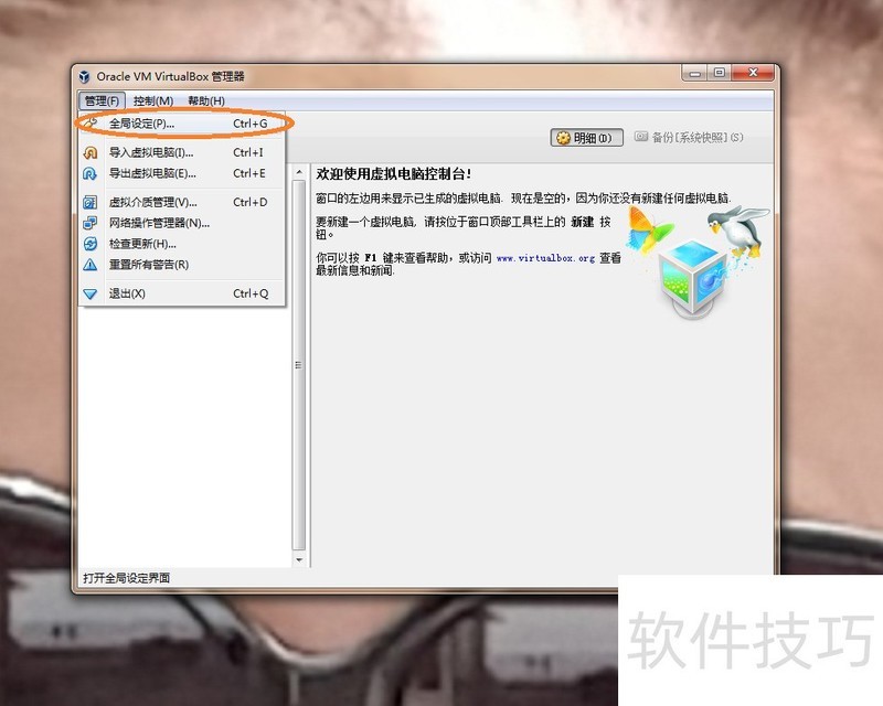1、 启动VirtualBox,然后选择“管理”>“全局设定”