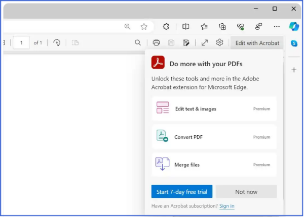 然而,最新公告显示,微软将强制所有用户,包括企业用户,迁移至新引擎。尽管测试显示新引擎表现稳定,但其明显的品牌推广方式——如屏幕右下角的Adobe Acrobat标志和“Edit with Acrobat”按钮——引发了部分用户的不满。用户认为这种广告式图标过于显眼,且“Edit with Acrobat”功能需付费订阅,与网络上丰富的免费PDF编辑工具相比,显得并不实用。官方已更新相关页面,详细说明了新引擎的推行时间和旧引擎的退役时间表,并回应了用户的疑问。