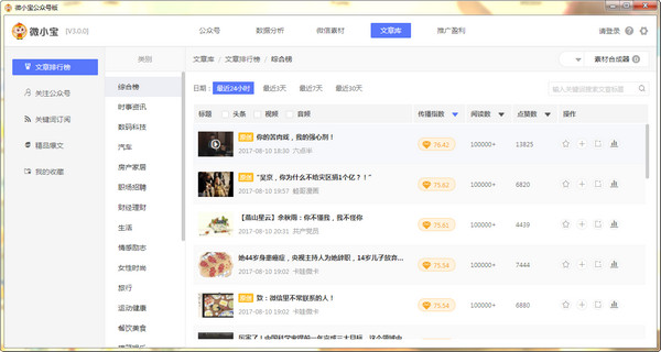 微小宝公众号助手是一款专为公众号运营者设计的软件,提供了粉丝管理、素材管理、数据分析等功能,帮助用户更好地运营公众号。用户可以使用该软件来管理粉丝消息和分组,及时提醒消息,并且可以随时随地发送素材和查看历史消息。此外,该软件还提供了文章资源库和文章排行榜等功能,帮助用户快速合成素材并统计公众号粉丝变化情况。同时,该软件支持所有公众号的定时群发功能,并且可以将本地素材同步到多个公众平台中。微小宝公众号助手是一款非常实用的工具,适合所有从事公众号运营的人员使用。