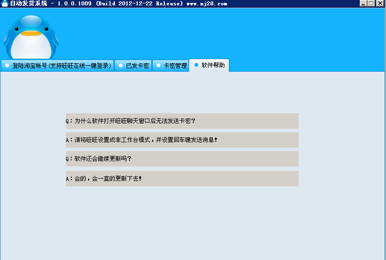 官方软件分类:淘宝开店大小:1.67 MB时间:2016-08-17软件介绍:淘宝自动发货系统可以使卖家不用登陆阿里旺旺或在电脑旁就可以卖东西, 可以让卖家实现24小时无人值守全天候 立即下载划时代卖家工具箱 6.9.1