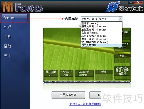 2、 下载好后,安装(这个太简单就不说了),主要说一下它的使用。3安装好后,会弹出这样一个窗口,也就是Fences的配置等操作,下面我一一介绍。 ?4布局:就是桌面新建的围栏怎么放置,这里有底部,靠右等