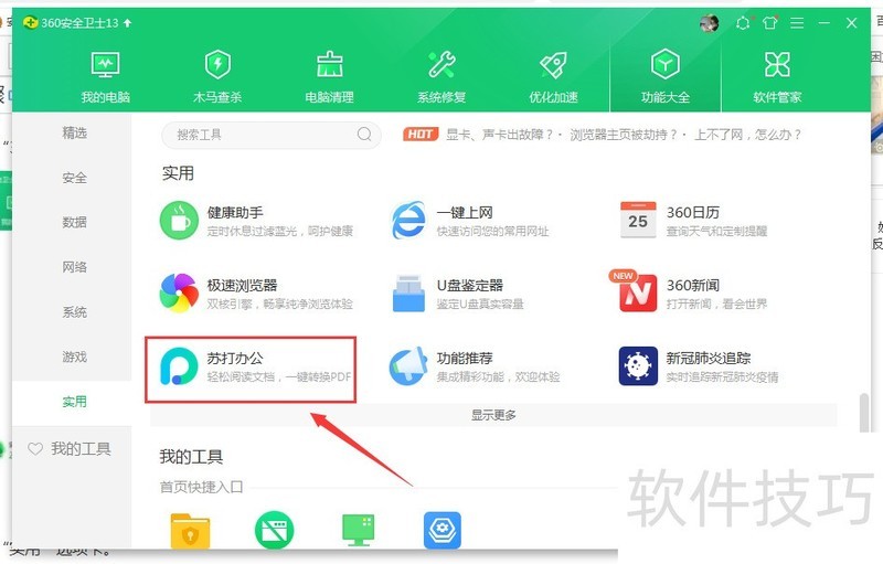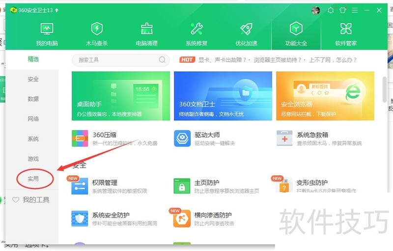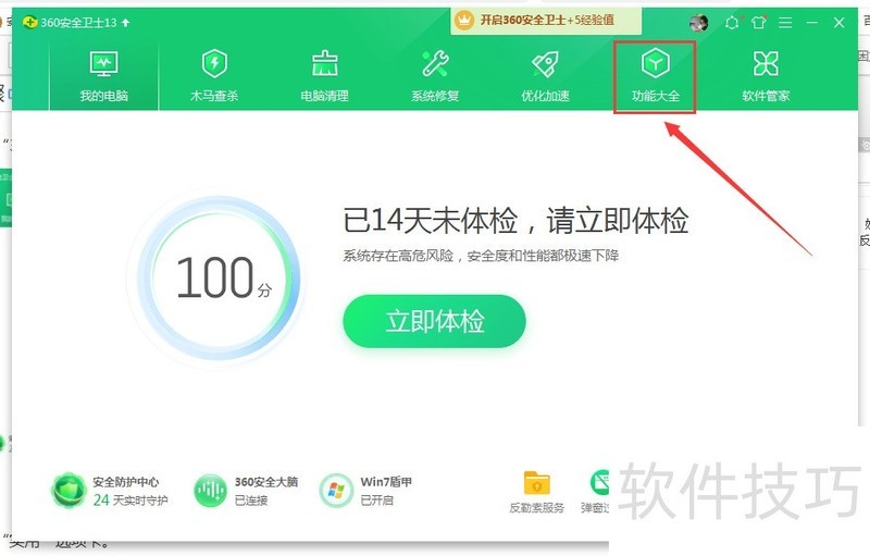 1、 打开“360安全卫士”软件,再点击“功能大全”按钮。