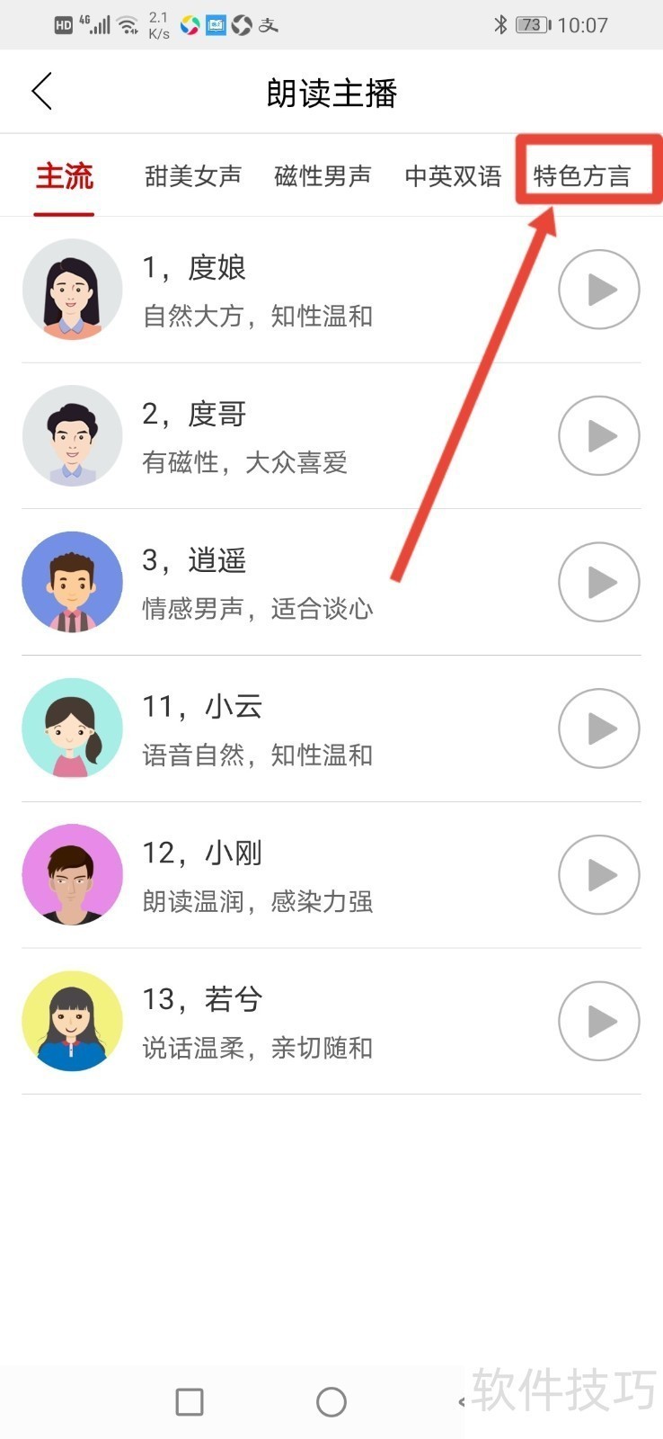 5、 来到朗读主播页面点击【特色方言】。