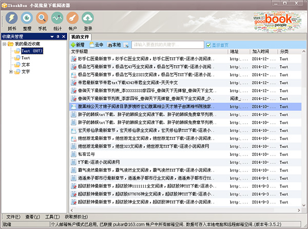 IbookBox小说批量下载阅读器是一款功能强大的电子书抓取和阅读工具。它能够自动抓取各种小说网站上的电子书,并将其保存到本地电脑中。用户只需输入小说书名,即可搜索到关于这本小说的各个网站的章节地址,并自动下载到本地。此外,该软件还支持将抓取的电子书生成txt格式并发送到手机中,以及将电子书自动存储到用户自已的邮箱中。用户无需人工干涉,只需运行软件即可完成整个过程。同时,该软件支持离线阅读,在所见即所得的界面下看到什么样的书,想下载就可以立即下载。IbookBox小说批量下载阅读器是一款非常适合手机用户使用的电子书抓取和阅读工具。