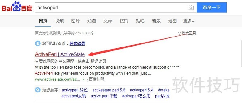 1、 打开浏览器搜索:? ?在搜索框中填入“ActivePerl”,点击搜索。